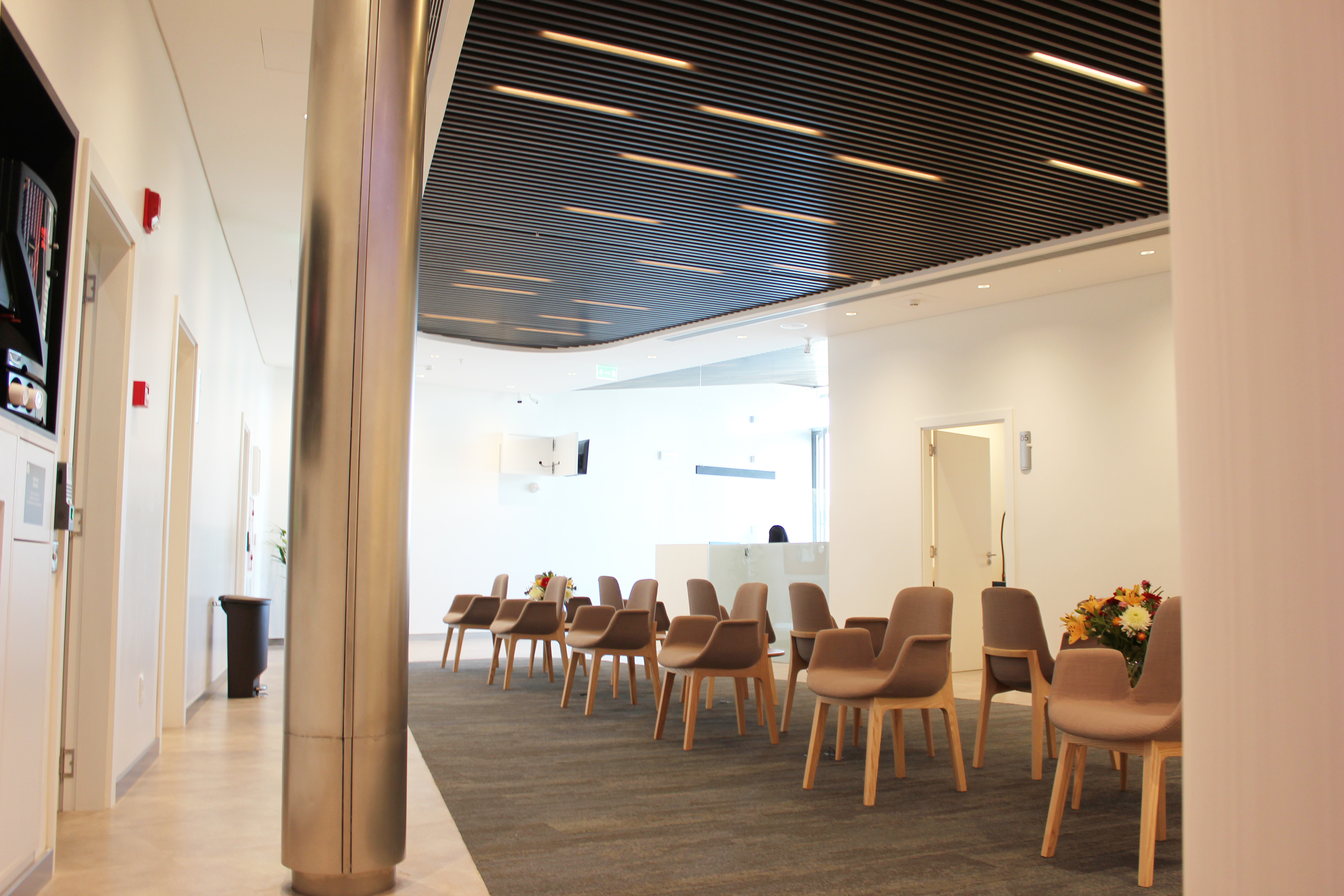 En el segundo nivel de 70m2 se ubica la parte privada de la clínica, donde están los vestuarios de funcionarios, estar de funcionarios, sala no break, economato, deposito y sala de equipos.